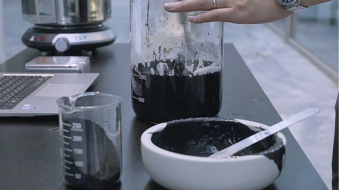 〈溪山清遠〉的裝置看起來像是一個頗有人文雅趣的書畫空間,但其所陳述的卻是越來越嚴重的空汙問題。藝術家張碩尹與台灣大學環境衛生研究所合作,將日常的空汙轉換成繪畫的墨汁,呈現出空汙對社會、家庭與個人所產生的影響,作為一項社會提案。