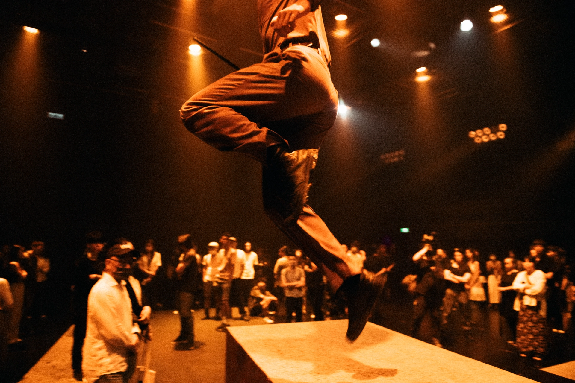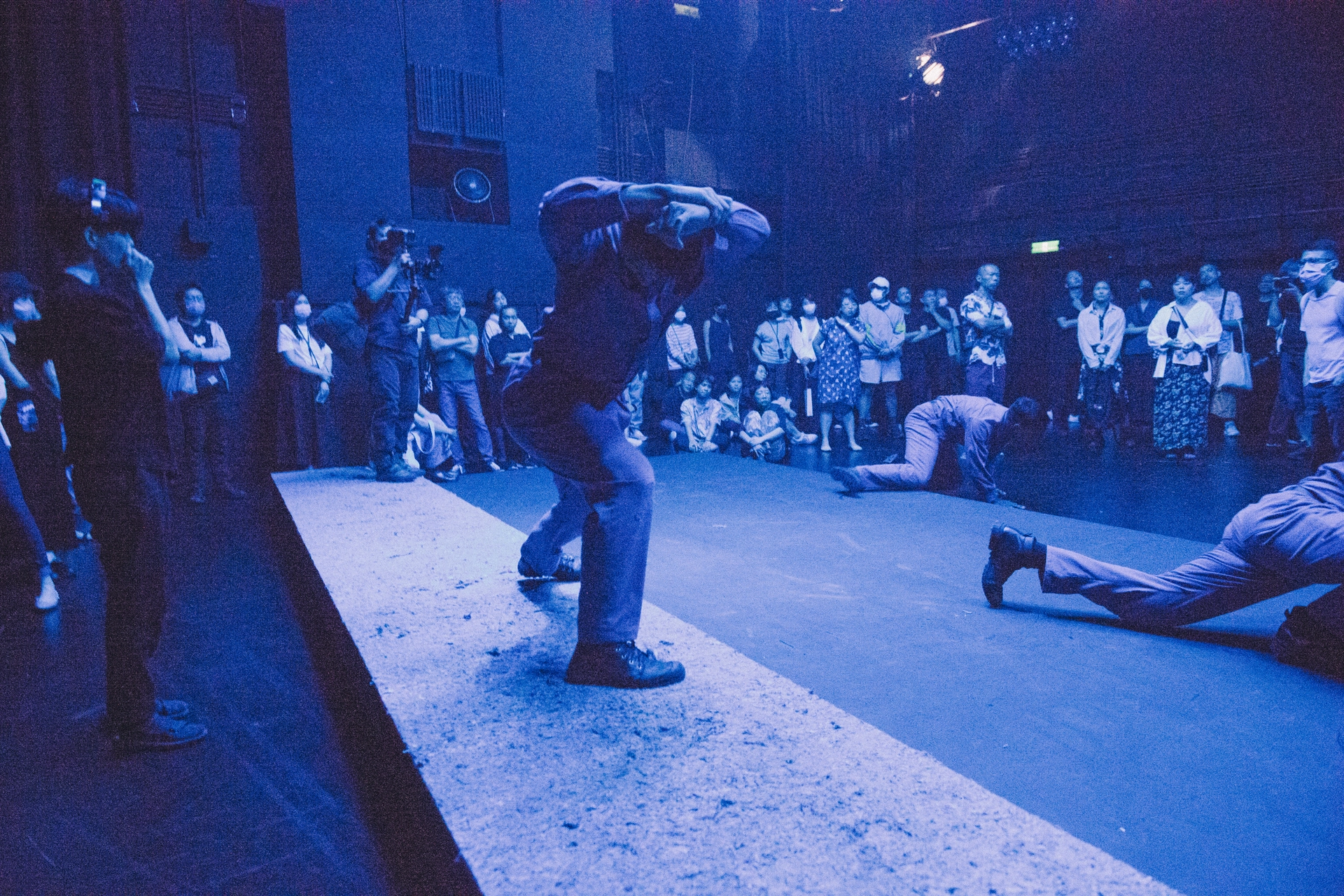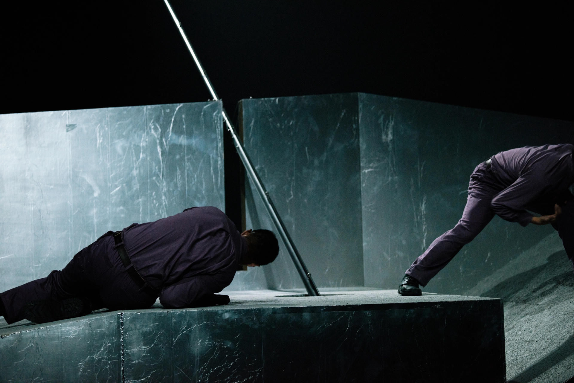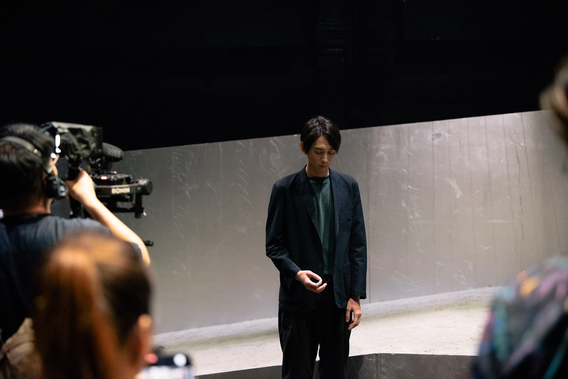 這次的作品也與多位藝術家在舞台裝置、燈光、和聲響方面合作,透過隱匿視線的建築量體、濃霧中強烈閃爍的光線、高懸的黑色旗幟和變造的警示聲響等傳達政治隱喻,在高頻切換觀眾感知的同時,也在延續的幻覺中重組現場散落的寓言。