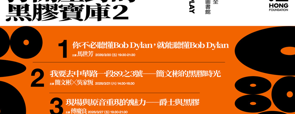 首先,為這批塵封的黑膠收藏重獲新生的古碟工作室負責人林耀民現身說法,不只談談這批唱片的整理過程,也將播放其中幾張稀有且具有代表性的唱片。接著2026年初春,邀請衛武營國家藝術文化中心藝術總監簡文彬(他當年曾經是洪建全視聽圖書館的付費會員!)分享他的黑膠經驗;馬世芳則帶領聽眾品鑑視聽圖書館的巴布.狄倫收藏(洪建全視聽圖書館居然購買美國流行音樂唱片?!);資深爵士達人傅慶良則會挑幾張爵士專輯,以專業音響播放,娓娓道出唱片背後的故事。