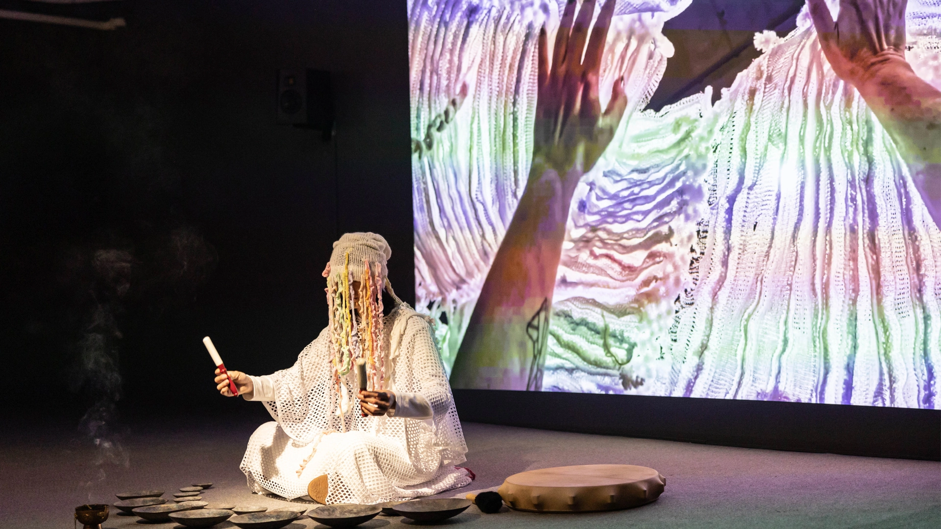 藝術家林沛瑩結合了生物科學、社會文化及藝術等不同領域的切入角度,呈現人類與病毒多種對立或磨合的交疊關係,並期待能夠帶領觀眾得到自己面對病毒議題的態度。「互生 Inter-(Being) —林沛瑩個展」以病毒作為思考媒介,分別從精神、身體、行為等面向切入,作品〈相即共生練習簿-出神1:1〉為薩滿靈媒召喚冠狀病毒靈的降靈儀式,配合多宗教樂曲及肢體律動,透過手工針織模擬電子顯微鏡下的病毒蛋白質複製機制,是一個書寫病毒靈性的文化儀式;〈相即共生練習簿-族譜X〉則結合訊聯生物科技(Bionet Corp.)進行基因定序檢測,藝術家並進一步將自身基因中潛藏的病毒序列以紅色訊號標示出來,在快速閃動的投影中,揭示出人類與病毒已然在長期演化中共存、互生的事實;〈邊界溶解〉建構病毒爆發的想像敘事體,收集疫情下人對病毒所隱藏的慾望恐懼;〈合生體初生宣言(人類版)〉羅列了十個跨物種合作基本行為準則,探索與微生物共處的新模式。藝術家向病毒展開詰問,以非典型的語境,表述人類與病毒共存的新認知。